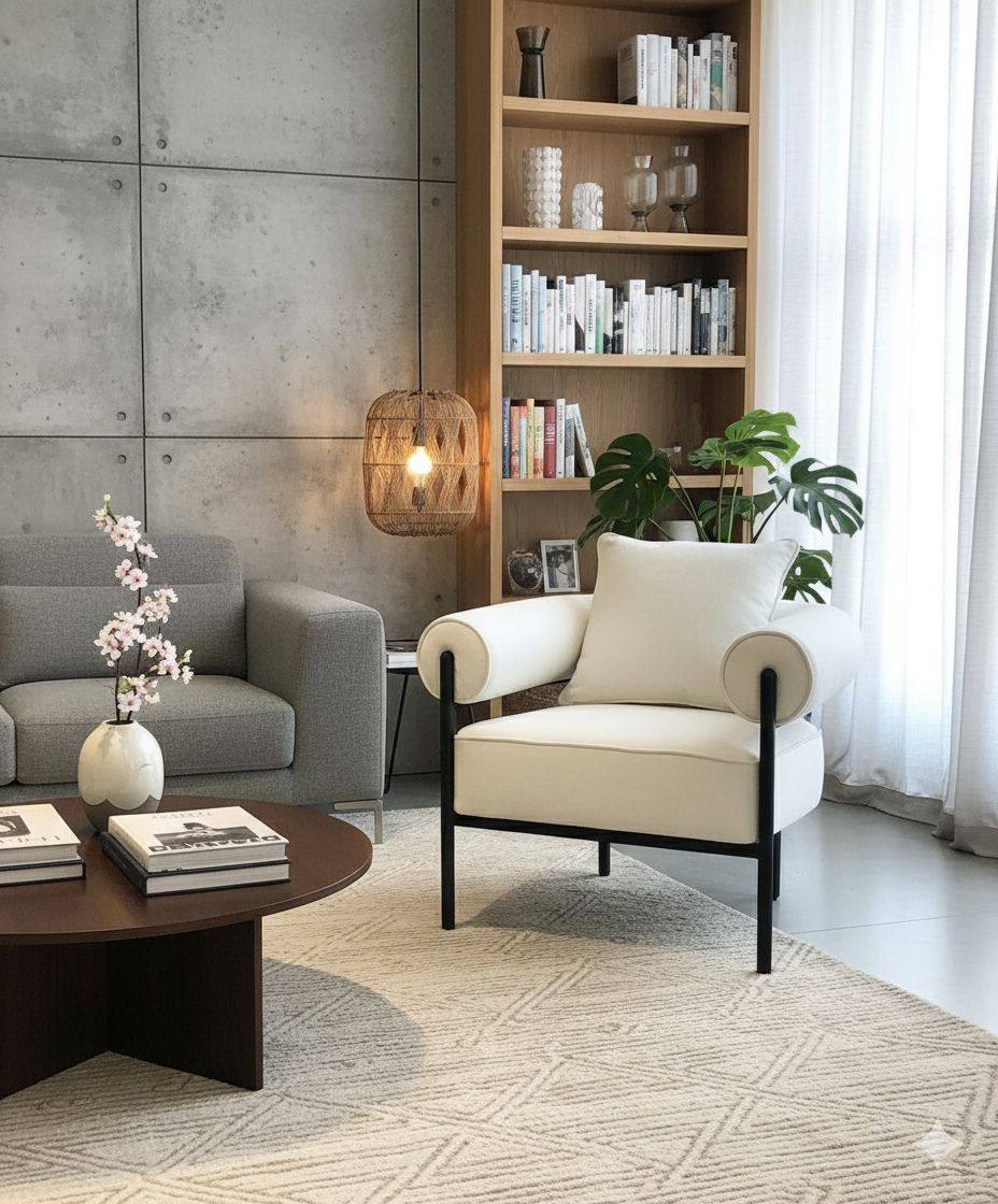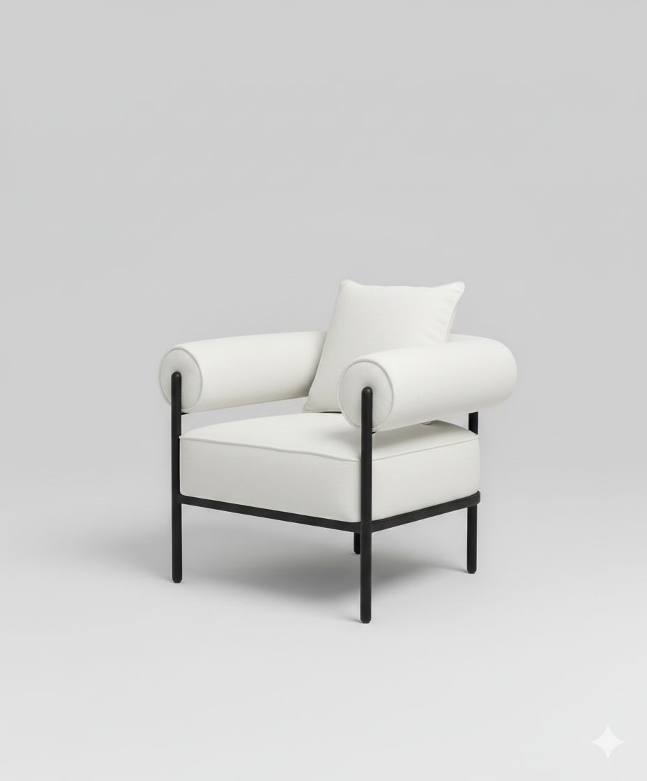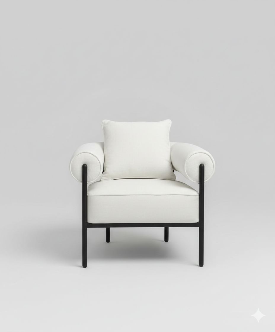 כורסה מעוצבת בגוון שמנת המשלבת עיצוב מודרני עם רגלי ברזל דקים, יוצרת מראה ייחודי ועדכני לכל חלל.