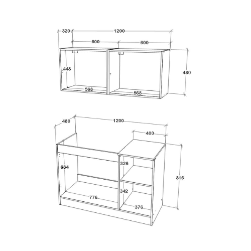 ארונות עליונים: רוחב 120 ס"מ, גובה 48 ס"מ, עומק 34 ס"מ.