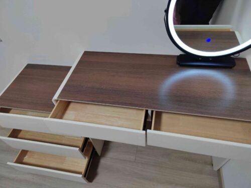 שידת איפור גרטה היא הפתרון המושלם לכל מי שמחפש שולחן איפור מעוצב ונוח, המשלב פונקציונליות עם מראה מודרני. עם 5 מגירות מרווחות לאחסון חפצים אישיים, מראה עגולה המוקפת בתאורת LED לשימוש נוח ונעים, ושולחן בצבע מוקה עם שלוף חום אגוז – שידת האיפור הזו תביא יוקרה וארגון לכל חדר שינה או חדר איפור.